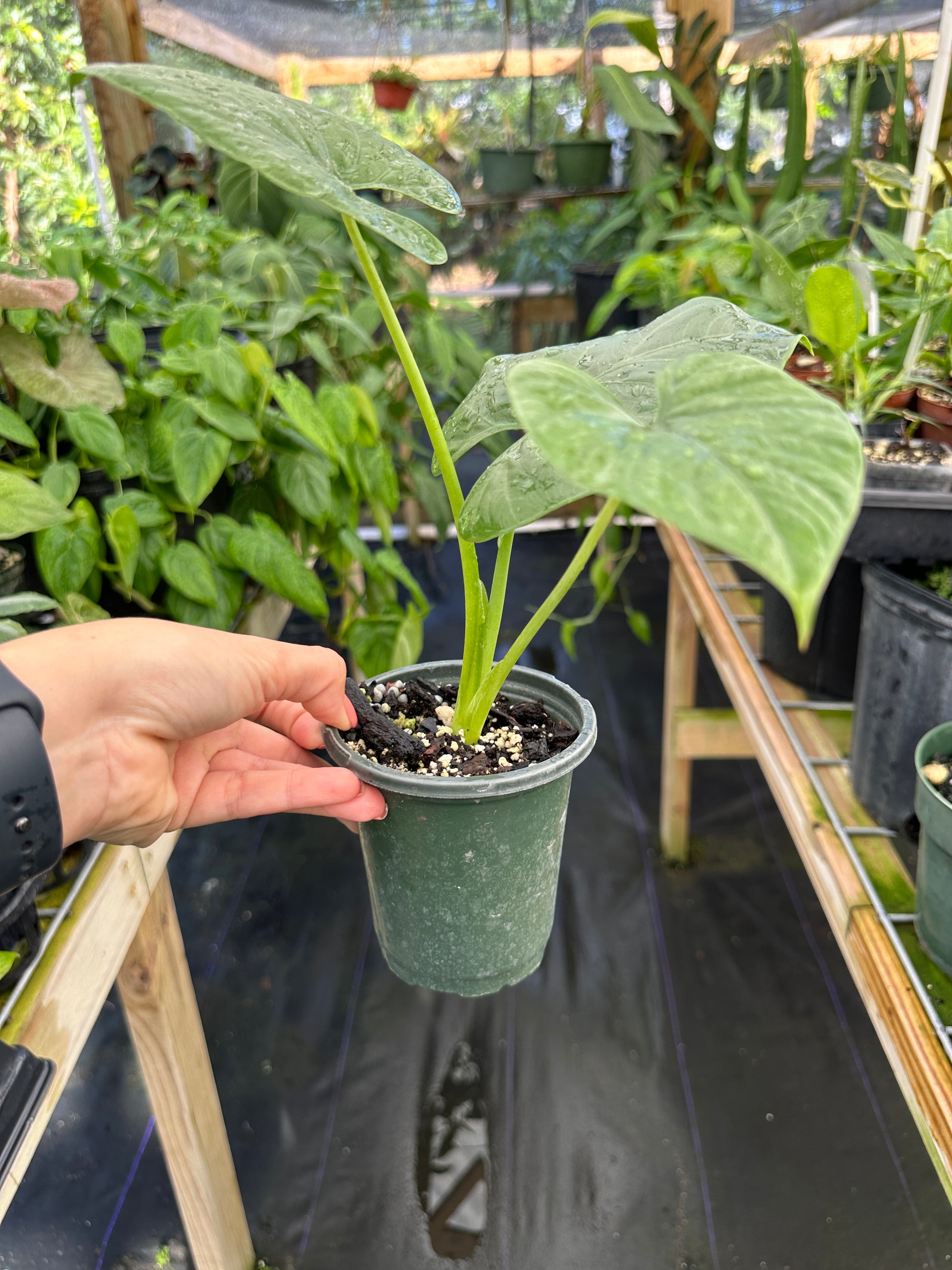 Description: Alocasia Alba is a rare tropical species not found in many US collections and sold by even fewer US Vendors. The leaves are heavily crinkled and stiff, with prominent veins on the back. The upright leaf shape makes it a wonderful outdoor container focal point, provided it's given the right care.