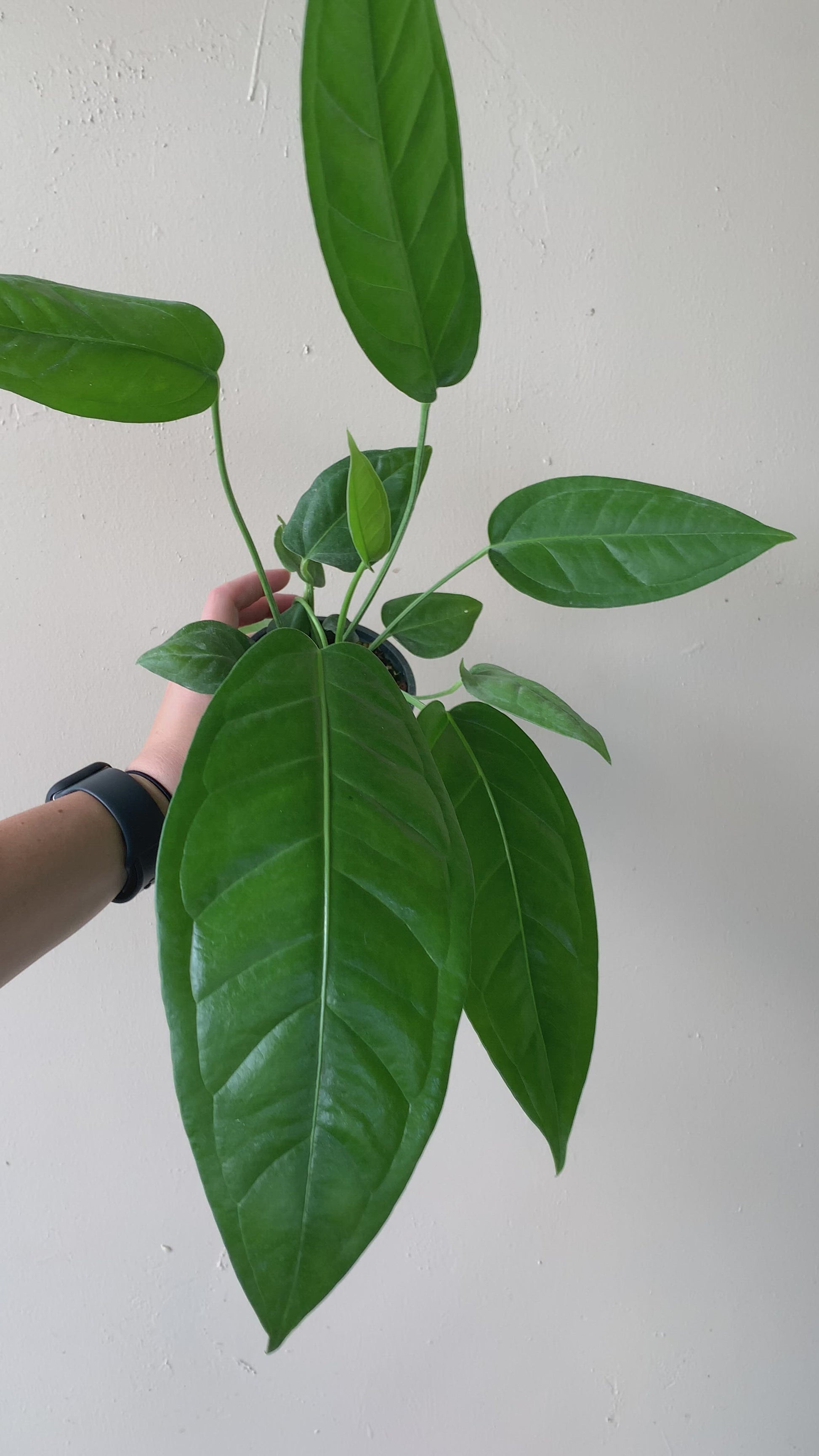 Description: Anthurium Pendulifolium is a fast growing epiphyte known for it’s long and glossy oval blade-shaped leaves. Great for hanging baskets or shelves where the pendulous leaves can spill over.
