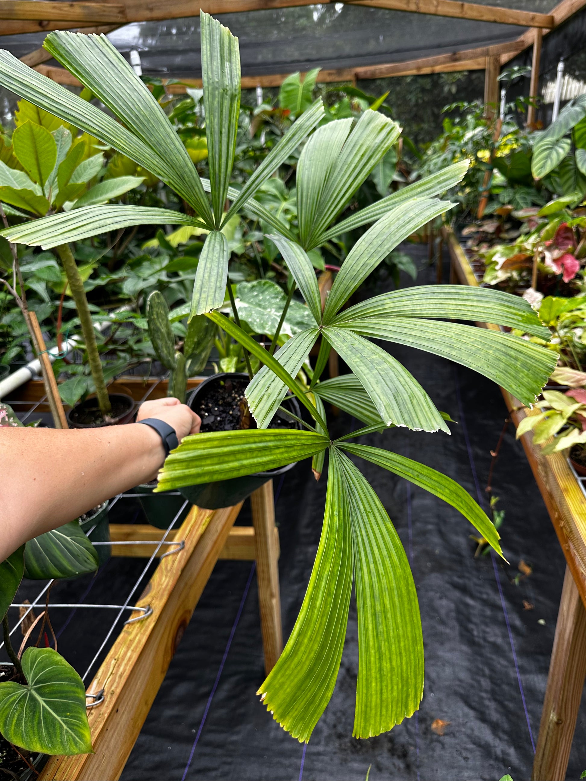 Care: Kept in Indoors or out this palm needs a warmth, consistent humidity, moist soil and filtered / indirect light. Too much direct bright light will change the beautiful signature mottling. Less finicky than the Iconic Licuala Mapu it can take brief cold spells, but should be protected from freezing temperatures or long periods of cold weather.