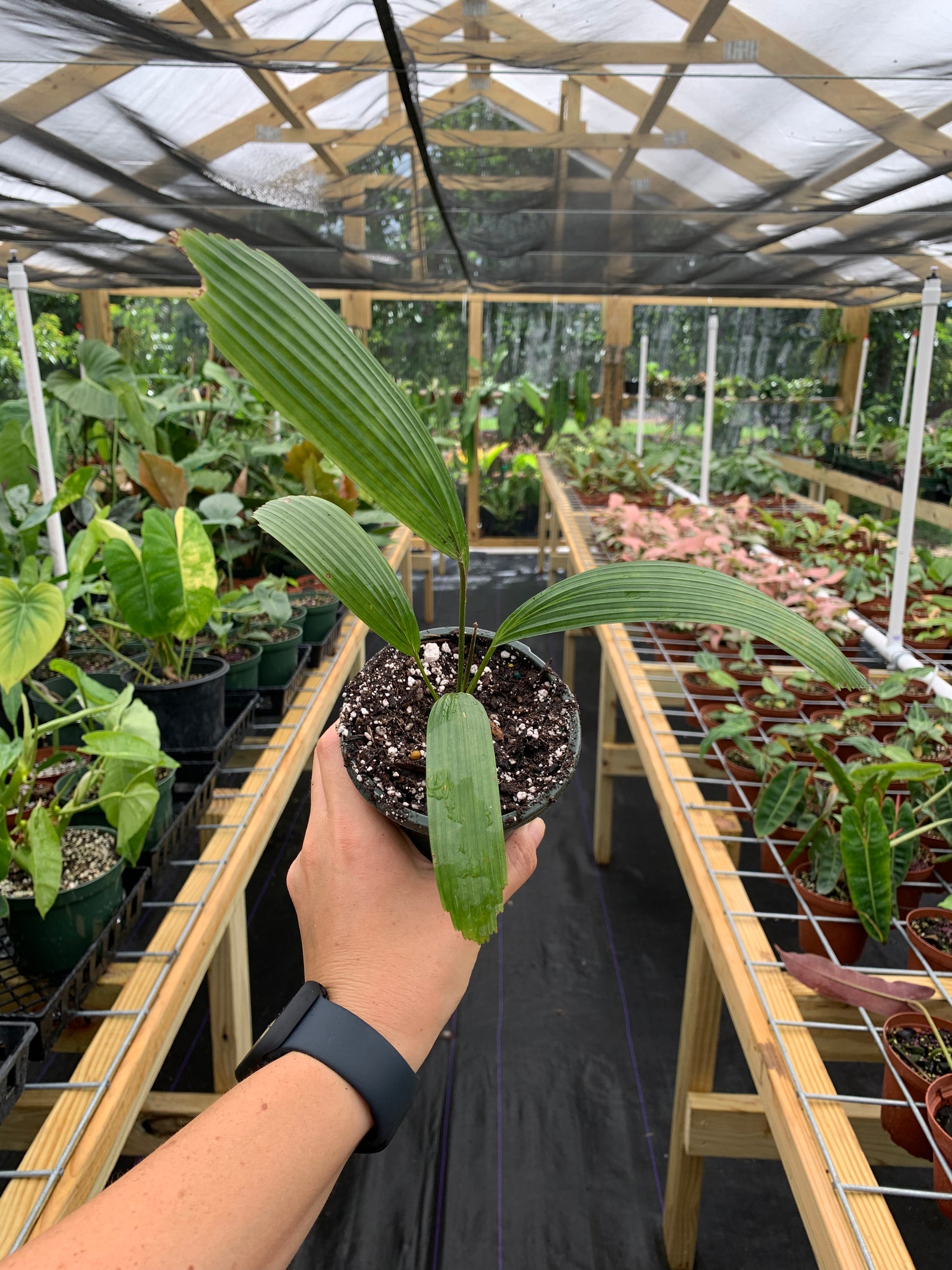 Care: Kept in Indoors or out this palm needs a warmth, consistent humidity, moist soil and filtered / indirect light. Too much direct bright light will change the beautiful signature mottling. Less finicky than the Iconic Licuala Mapu it can take brief cold spells, but should be protected from freezing temperatures or long periods of cold weather.