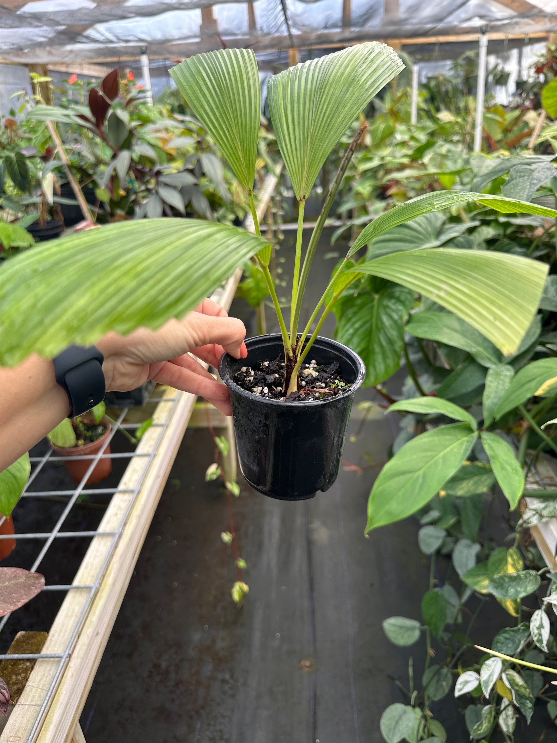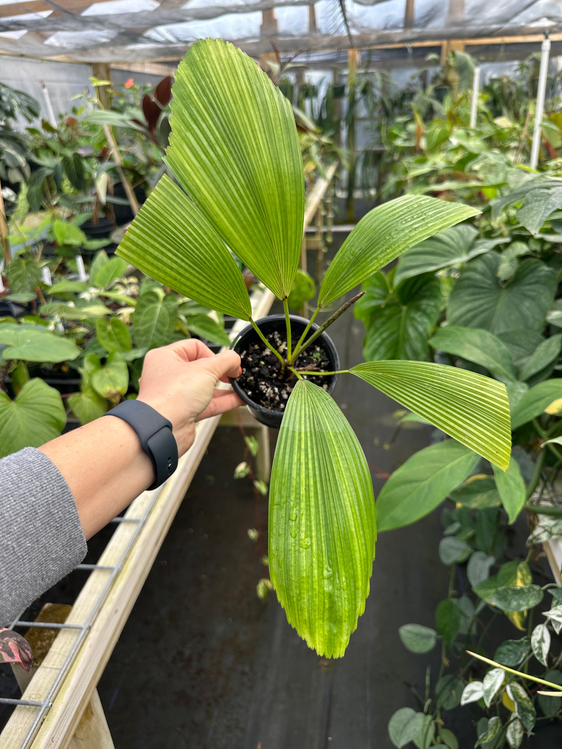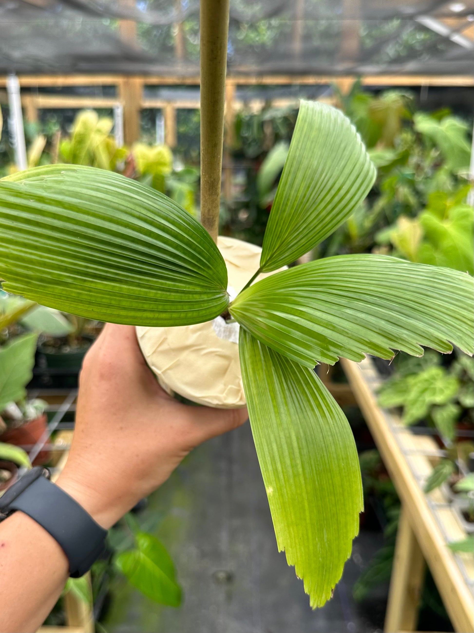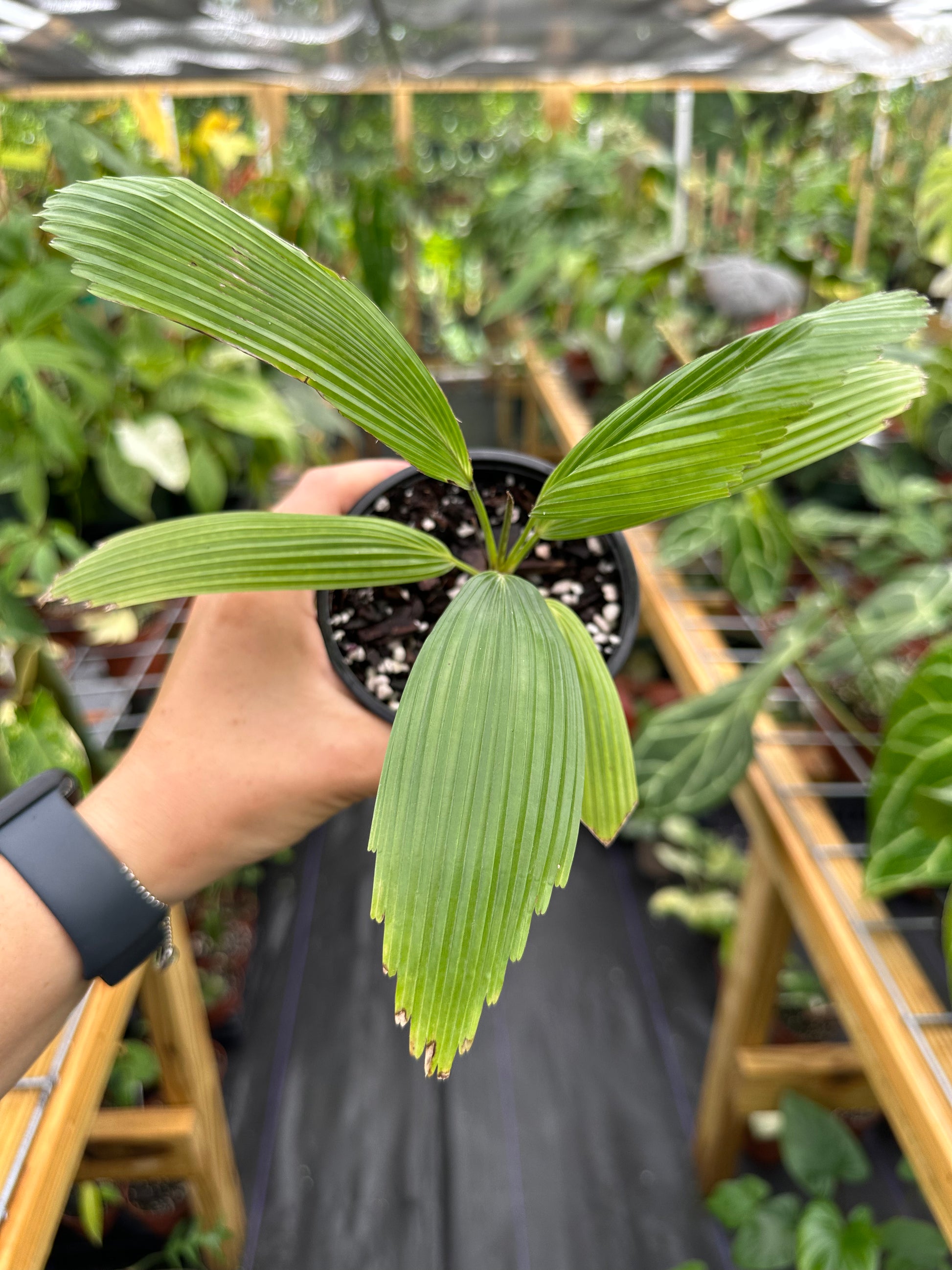 Care: A tropical rainforest palm, Licuala Cordata should be grown in part shade/low light and provided warm temps and high humidity. Protect from strong winds and cold temperatures. Provide a rich, well draining and slightly acidic soil and water often, allowing the water to flow freely out of the pot. Cold Hardiness Zone: 10b Can be grown in greenhouses if their preferred conditions are replicated.