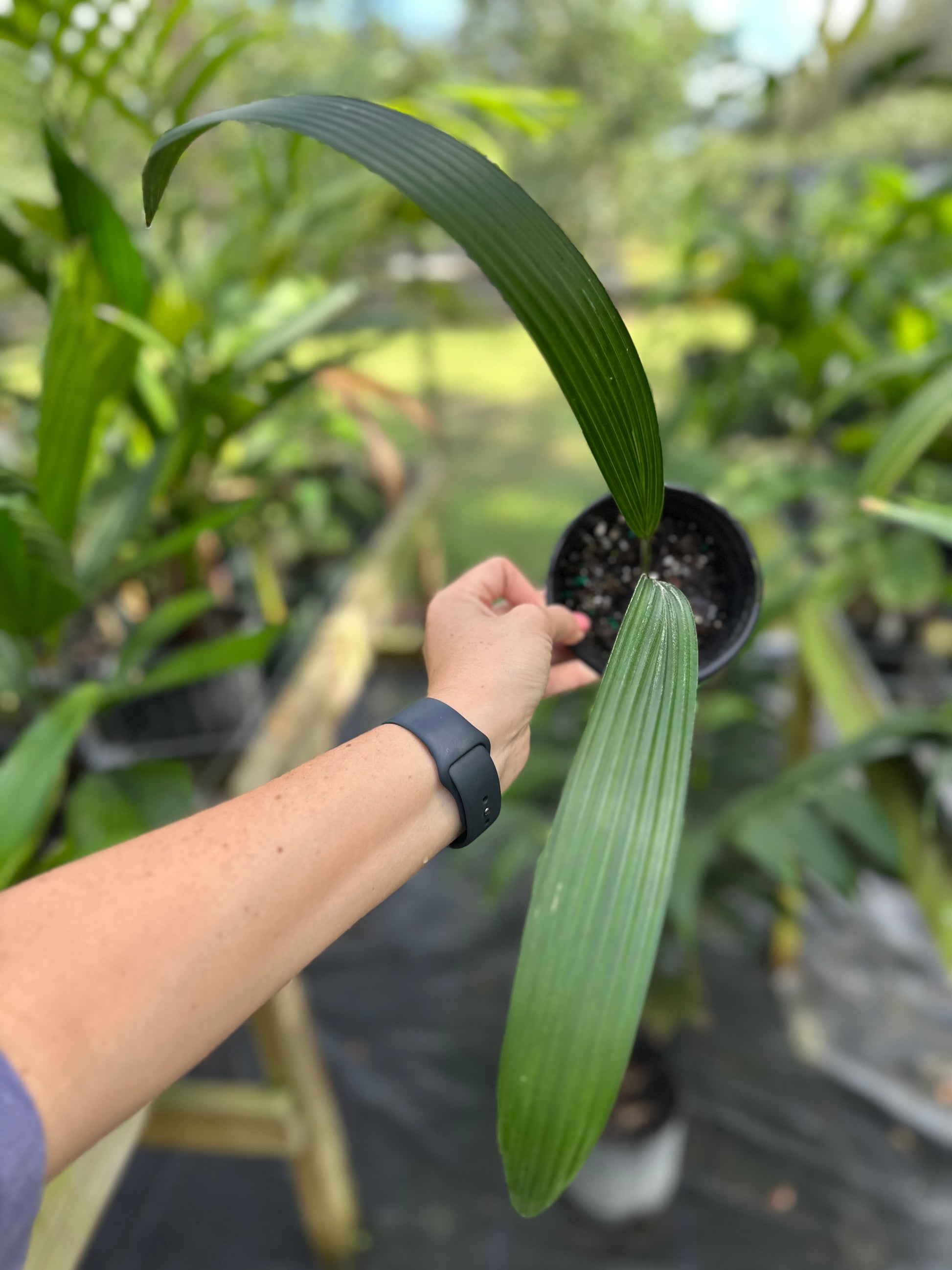 Care & Description: Recently discovered in remote Columbia, Sabinaria magnifica is described as one of the most beautiful palms in the world. The solitary palm has thick glossy green leaves with a blue/silver underside that are circular with a unique single split. Hailing from a moist tropical climate this palm requires warmth, humidity, and cold protection. We have a specimen planted in our South Florida garden Zone 10b/11 in part sun doing very well.