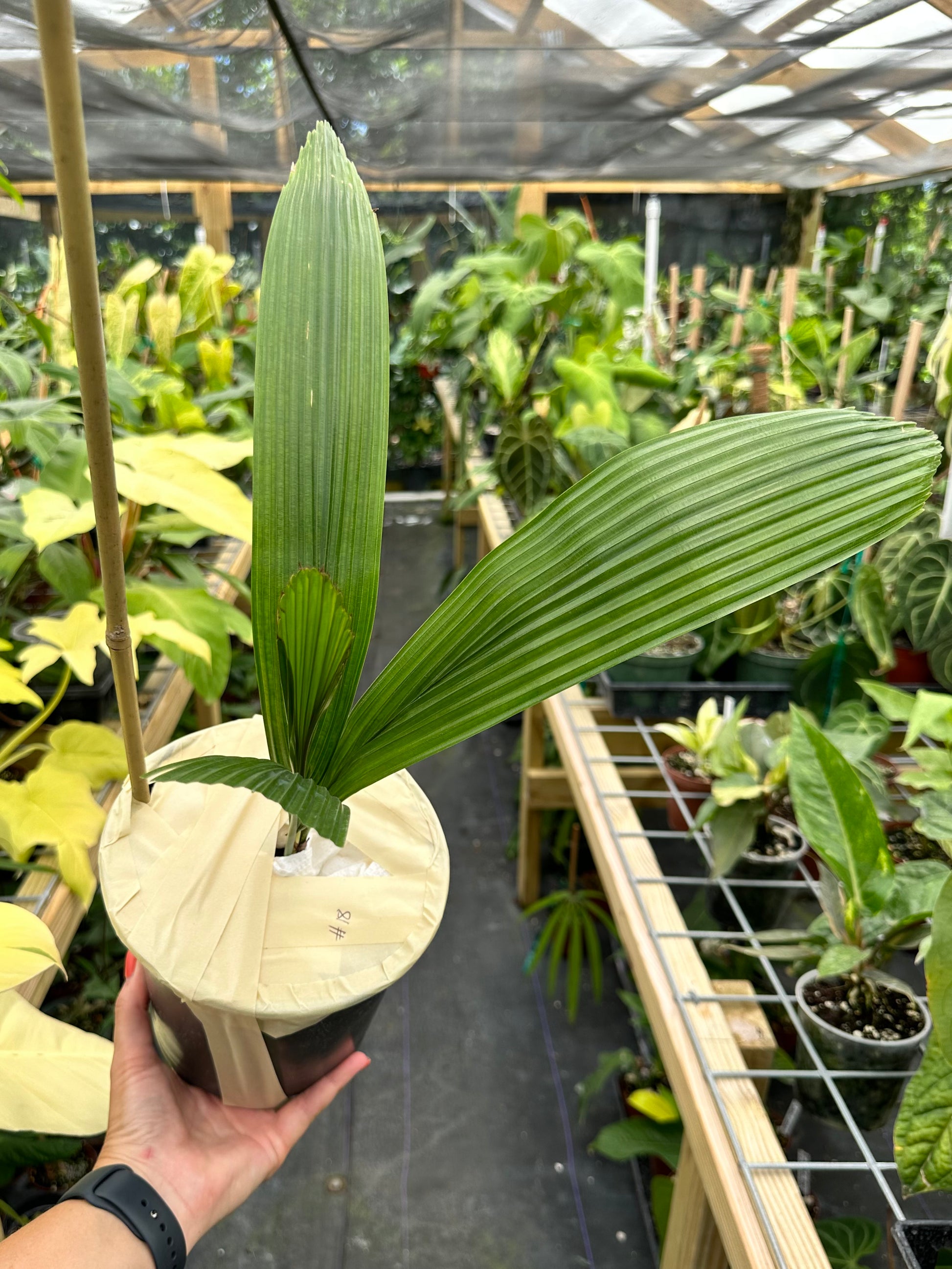Care: This palm loves high humidity and warmth. It is very sensitive to the cold and should be protected if temperatures drop below freezing. Place in shade to part shade and protect from strong winds. It enjoys moderate watering, but is easy to overwater, it requires soil with very good drainage.